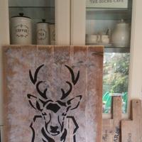 Dit mooie steigerhouten schilderij/wandbord van +/- 60x80cm gaan we eerst wit wassen. Hierna schilder je met een sjabloon het hert erop. Mooi voor de winterdagen en voor Kerst.